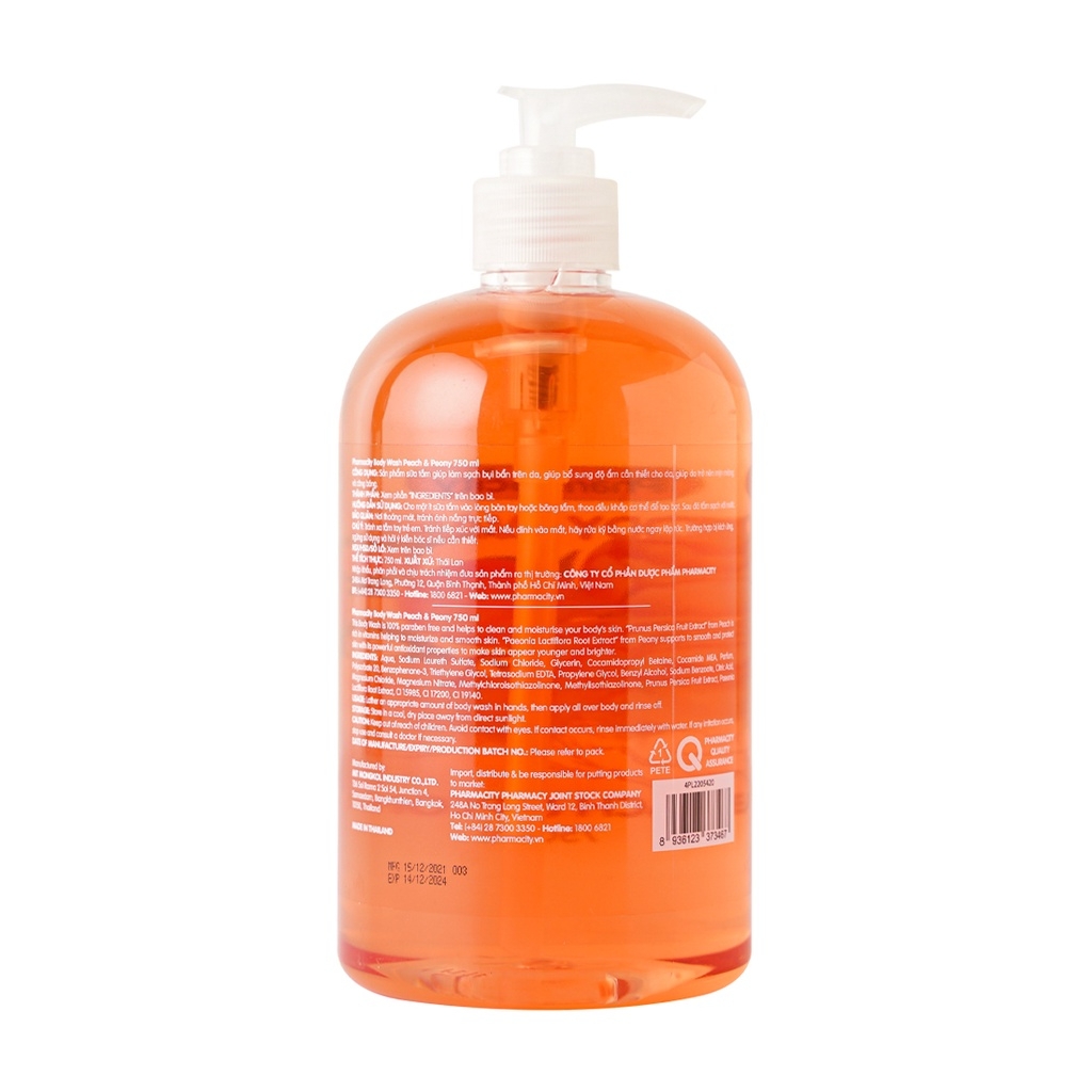 Thành phần: Aqua, Sodium Laureth Sulfate, Sodium Chloride, Glycerin, Cocamidopropyl Betaine, Cocamide MEA, Parfum, Polysorbate 20, Benzophenone-3, Triethylene Glycol, Tetrasodium EDTA, Propylene Glycol, Benzyl Alcohol, Sodium Benzoate, Citric Acid, Magnesium Chloride, Magnesium Nitrate, Methylchloroisothiazolinone, Methylisothiazolinone, Prunus Persica Fruit Extract, Paeonia Lactiflora Root Extract, CI 15985, CI 17200, CI 19140.Công dụng: Sản phẩm sữa tắm giúp làm sạch bụi bẩn trên da, giúp bổ sung độ ẩm cần thiết cho da, giúp da trở nên mịn màng và căng bóng.